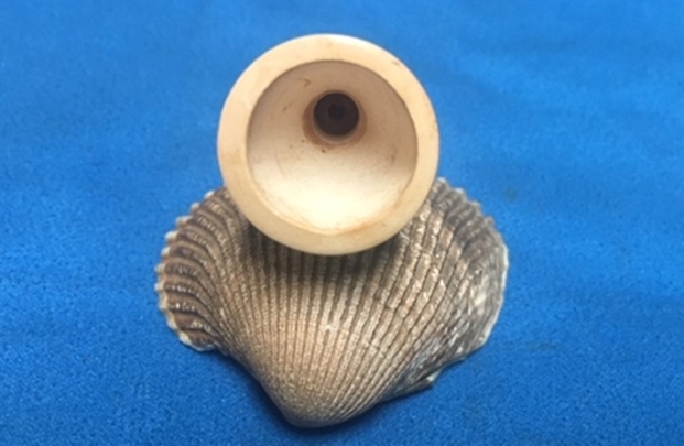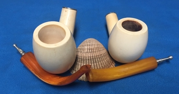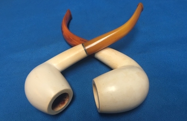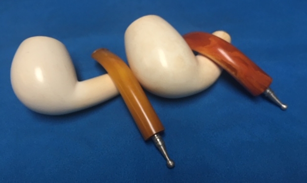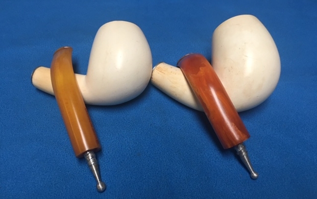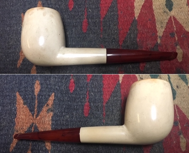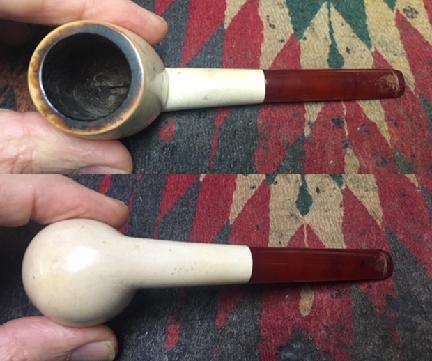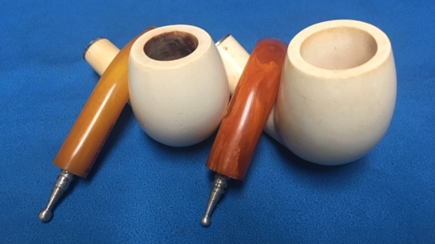 I took photos of each of the pieces in the collection. I cleaned up the straight billiard on the left side of the photo above and have written the blog on it (https://rebornpipes.com/2019/07/21/restoring-an-old-cased-set-of-aristocrat-meerschaums-part-1/). Give the blog a read and you will see the story of the restoration. The next piece I chose to work on was the Aristocrat Cigar Holder shown in the photos below. It had also been smoked – lightly but still it was used. There was some darkening in the bowl and the stem had a lot of tooth marks and chatter on both sides at the button.