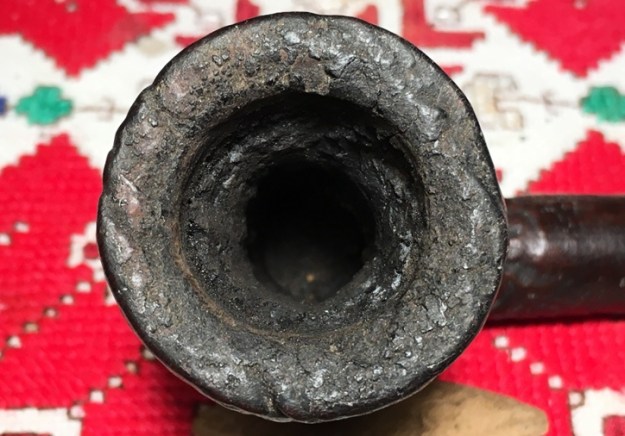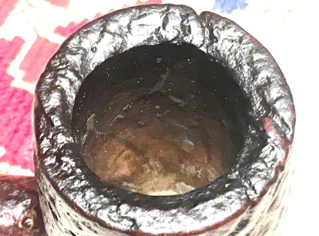 The condition of this Henley resembles the others in that they are very dark and dirty from grime over the stummel. The blasted surface of this Henley will need much scrubbing with a brush. One crevasse is so large/deep that when I first saw it, I thought that the bowl had cracked. However, it is the result of the blasting process. The blasted surface is amazing on this pipe. The chamber is choked with carbon cake buildup – this needs to be removed to give the briar a fresh start and to examine the chamber walls. With the cake as thick as it is, there is concern for heating damage. The rim is inundated with lava flow – it’s thick! The saddle stem has also seen better days! The oxidation is thick, and the bit has been chewed – or more accurate, clenched. There are several compressions on both upper and lower bit – the former steward loved this pipe, but he was a hands-free clincher which would be no small feat for a pipe with a bowl this big!