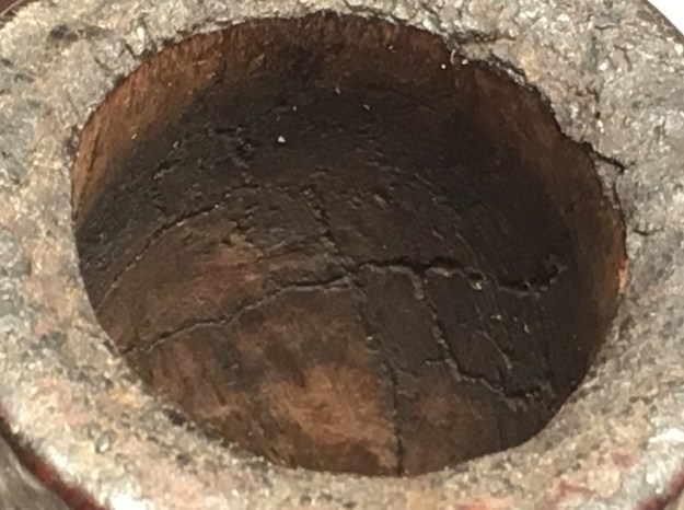 I take pictures going around the chamber from different angles. With the thickness of the cake that I removed, I’m not surprised to find heating damage. I’m sure that the cracks and fissures that I’ve pictured are a result of the heat build-up caused by the thick cake and not allowing proper heating expansion and contraction. This puts more stress on the briar and these results occur. As I continue the cleaning, my mind will be processing the question of how to address this.