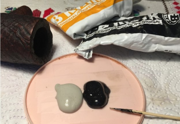 To help provide a protective coat over the repairs and to encourage a new cake to develop, I apply to the chamber walls a coating mixture of natural yogurt (sour cream works, too) and activated charcoal. I mix a small amount of yogurt and charcoal in a bowl and when the consistency of the mixure will not drip off the spoon its ready to go. After putting a pipe cleaner through the draft hole, I use my index finger to reach into the chamber and apply the mixture. I make sure that the chamber walls are thoroughly covered, and I put the stummel aside for a time to allow the coating to cure. It dries into an amazingly hard surface. It’s important for the new steward to use a folded pipe cleaner to clean the bowl initially after putting the Henley into service – not to scrape the bowl!