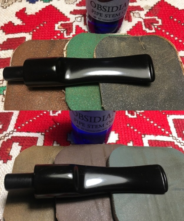 I move directly to applying the full regimen of 9 micromesh pads starting by wet sanding with pads 1500 to 2400 then dry sanding with pads 3200 to 4000 and 6000 to 12000. Between each set of three pads I apply a coat of Obsidian Oil to assist in rejuvenating the vulcanite. The saddle stem has that glassy pop!
