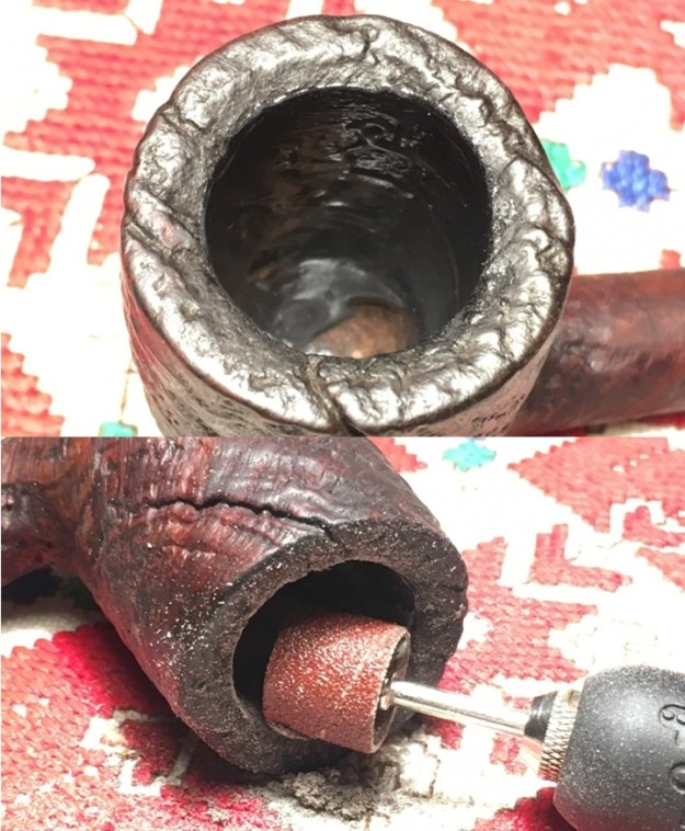 With a chamber width of 7/8 inches and depth of 2 inches, he took all 4 blade heads that the Pipnet Reaming Kit had to offer. The cake is hard and crusty, and it takes patience to work the blades and not overdo it. I follow the reaming using the Savinelli Fitsall tool to continue to scrape the chamber walls clearing more carbon. Finally, I sand the chamber using 240 grade paper wrapped around a Sharpie Pen. The sanding is very helpful in cleaning the walls to allow inspection.