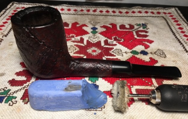 After about 20 minutes I wipe off the excess Balm and buff the blasted Henley Special stummel with a microfiber cloth. The hues are deeper and richer. I mount a cotton cloth buffing wheel onto the stummel and set the speed at 40% full power and after reuniting the stem and stummel, I apply Blue Diamond compound to the stem. As I go along, I experiment with the Blue Diamond on the stummel. I don’t want to gum up the craggy surface with Blue Diamond, but what I see, with a light application of the compound, is that the briar is sprucing up and I move the wheel along with the grain of the blasted briar. I like the results. When I complete the application of Blue Diamond, I give the pipe a good hand-wiping with a felt cloth to remove the carbon dust before application of the wax. I like the results.