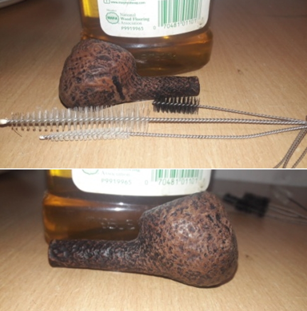 Next, I cleaned out the internals of the shank and mortise. Using my dental tool, I scraped out all the dried oils, tars and gunk that had accumulated in the shank airway and mortise. The amount of crud that was scrapped out and the condition of the pipe cleaners that were used leaves no surprise why air flow through it was restricted. I finished the cleaning by running a few pipe cleaners dipped in isopropyl alcohol. I also wiped the shank with cotton buds and alcohol. With this cleaning, all old smells in the pipe are history. The pipe now smells clean and fresh.