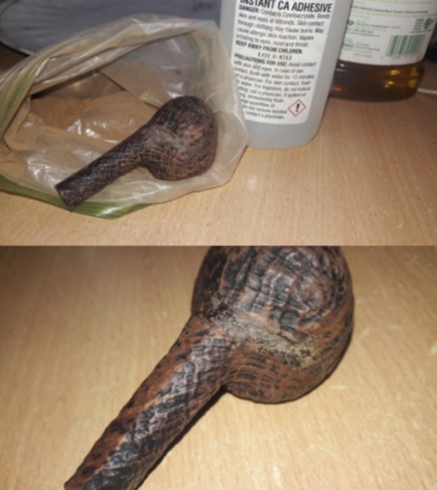 I cleaned the fill of all the debris of old fill material, wiped it with alcohol and refreshed the fill with a mix of clear CA superglue and briar dust and set it aside to cure overnight.