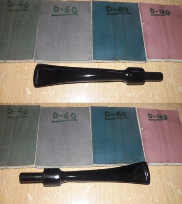 Using the micromesh pads, I completed the polishing cycle by wet sanding the surface with 1500 to 3200 girt pads. I had read that White diamond polish is between 3600 and 4000 grit of micromesh pads and best used between these two. I decided to give this a try to see if there is any difference in the final stem finish. I mount a fresh cotton buffing wheel on to my hand held rotary tool and apply white diamond polish and buffed the stem. I wiped the stem with microfiber cloth and go through the remaining pads, dry sanding with 4000 to 12000 grit pads. The stem looks great with the fills nicely matched with the rest of the surface. I rub a little quantity of Extra Virgin Olive oil in to the stem surface and set it aside to be absorbed by the vulcanite.