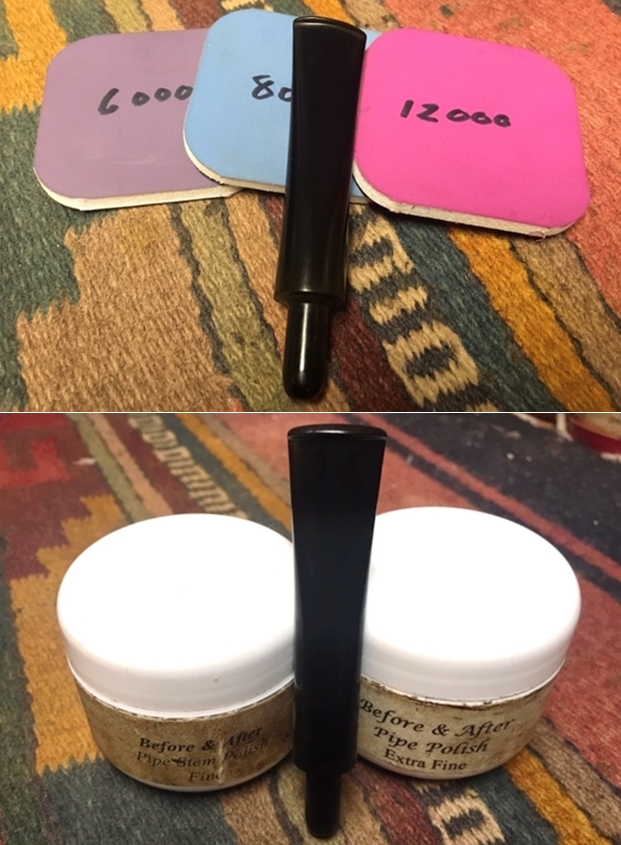 I set the bowl aside and turned my attention to the stem. I sanded the stem with 220 grit sandpaper to break up the oxidation. I started the polishing with 400 grit wet dry sandpaper to remove the scratching. It is starting to look good.