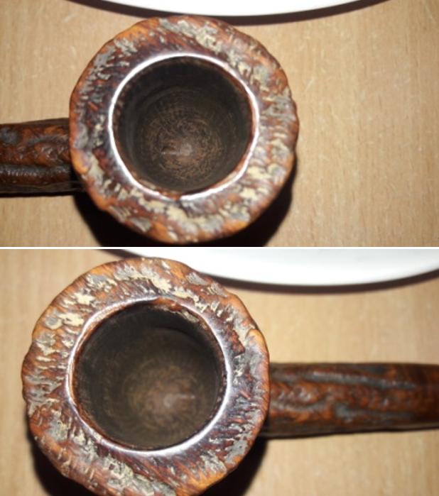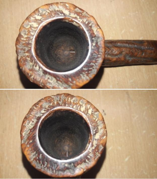 The chamber has a thin layer of cake and does not appear to have been smoked much, may be a few bowls at the max. The condition of the inner walls of the chamber can be determined only after the cake has been completely reamed out down to the bare briar. The draught hole is dead center and at the bottom of the chamber. This should be a fantastic smoker. The thin worm rusticated rim top surface is covered in dust and grime all these years of storage. The outer and inner edges of the rim are in good condition with no damage.