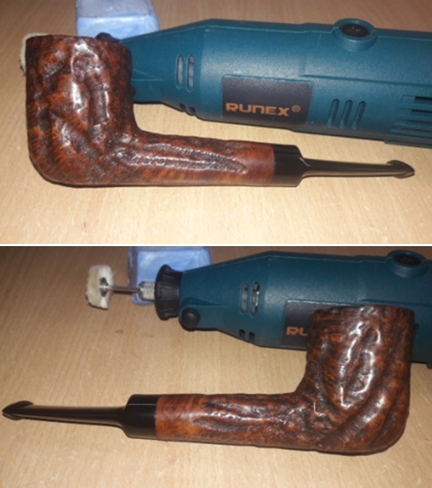 On to the homestretch!! I mount a cotton cloth buffing wheel on to my hand held rotary tool and apply a coat of Blue Diamond to the stummel and the stem to polish out the minor scratches.