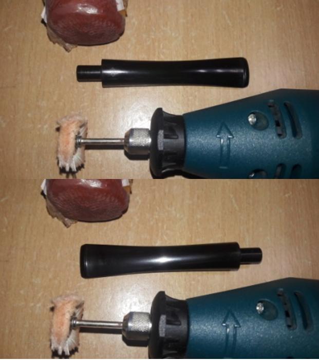 I followed up the sanding regime with micromesh polishing to bring a shine on the stem surface. I wet sand the stem with 1500 to 2400 girt micromesh pads. Continuing with my experimentations that I had spelled out in my previous posts, I mount a cotton buffing wheel on my hand held rotary tool and polish the stem with Red Rouge polish as I had read that this polish has grit between 2400 to 3200 grit pads of the micromesh pads. Further, I mount a fresh buffing wheel on the rotary tool and polish the stem with White Diamond polish as it has grit equivalent to 3800- 4000 of micromesh pads. I finish the stem polish by wet sanding with 6000 to 12000 grit pads of the micromesh. I rub a small quantity of olive oil in to the stem surface to hydrate it and set it aside. The stem looks nice and shinning black. I am really happy with this process of stem polishing as the results are excellent while saving me huge amounts of time and effort.