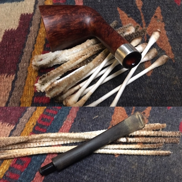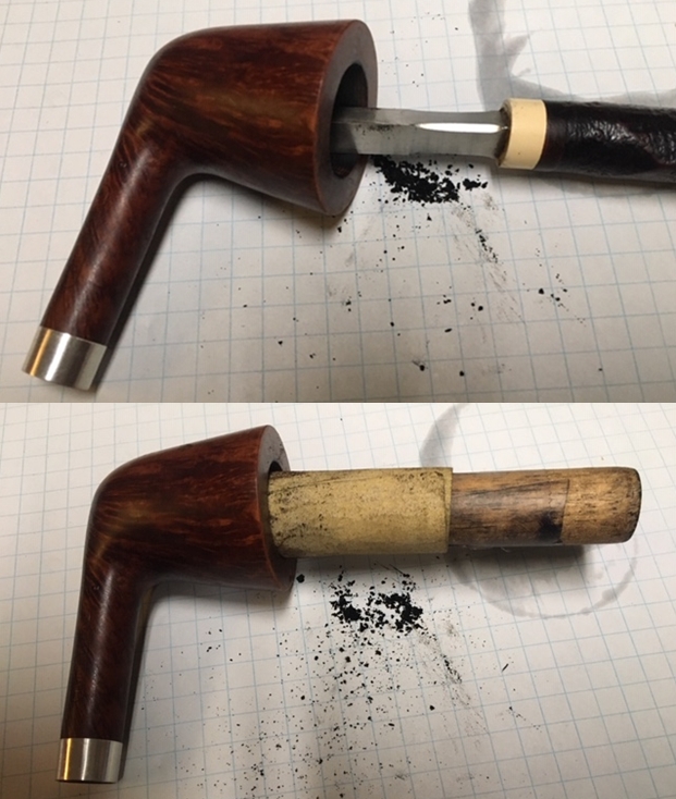 I continue the internal cleaning using pipe cleaners, cotton buds dipped in isopropyl 95%. A dental spoon assists in scraping oils and tar build-up off the sides of the mortise. After some effort, the pipe cleaners and buds start to lighten, and I call it clean for now. I’ll continue later with a kosher salt and alcohol soak to clean further.