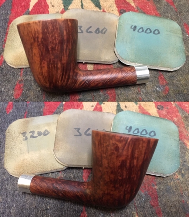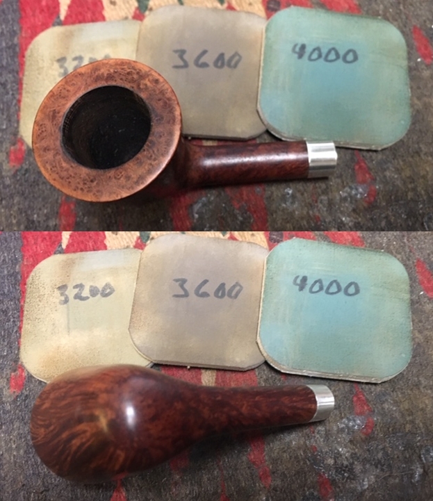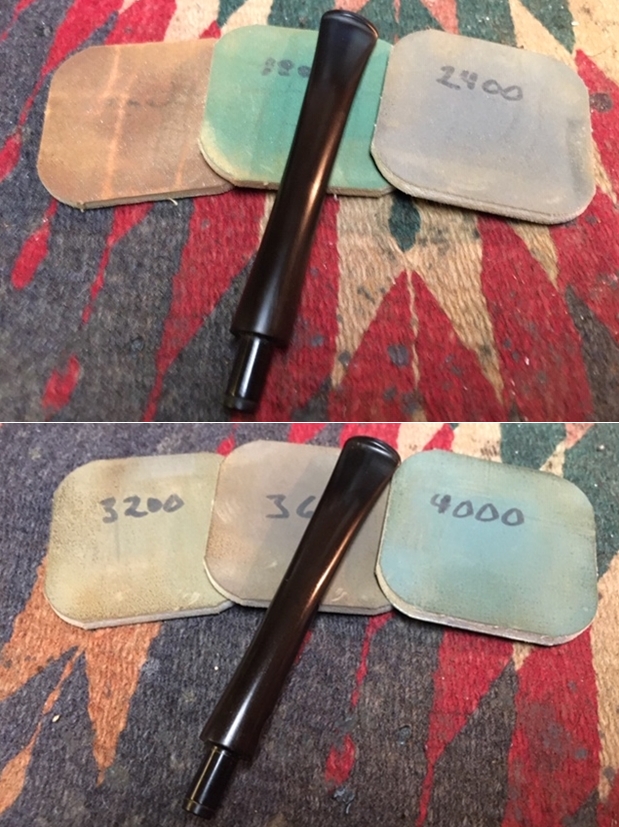 Next, as before, I apply to the bit area the full 9 micromesh pads from 1500 to 12000 by first wet sanding with 1500 to 2400 and dry sanding from 3200 to 12000. I apply Obsidian Oil between each set of three.