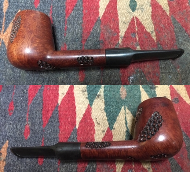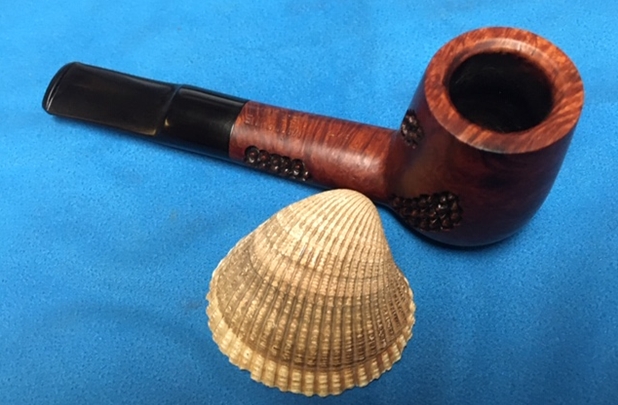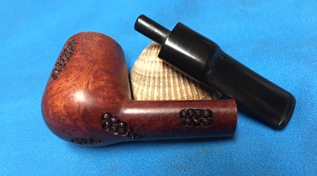 This is a finely carved, Spanish made Brandy shaped pipe marked Moonshine over Spain with the shape number 817 next to the shank/bowl junction. It has an interesting carved finish with grape-like shapes around the shank and bowl. It has a great look and feel. The shape fits well in the hand with the rustication giving the pipe a nice tactile sense when held. I polished stem and the bowl with Blue Diamond polish on the buffing wheel. I gave the bowl and the stem multiple coats of carnauba wax. I buffed the pipe with a clean buffing pad to raise the shine. I hand buffed it with a microfiber cloth to deepen the shine. The pipe polished up pretty nicely. The rich combination of the browns on the briar along with the carvings and the polished vulcanite stem work well together. I like the finished look of this Spanish Made Brandy. Have a look at it with the photos below. The shape, finish and flow of the pipe and stem are very well done. The dimensions are Length: 5 ½ inches, Height: 1 ¾ inches, Outside diameter of the bowl: 1 ¼ inches, Chamber diameter: ¾ of an inch. This Moonshine Brandy is a unique beauty. Thanks for walking through the restoration with me as I worked over another beautiful pipe.
