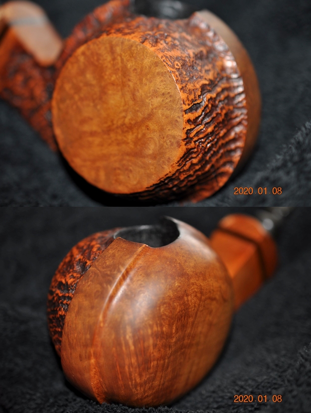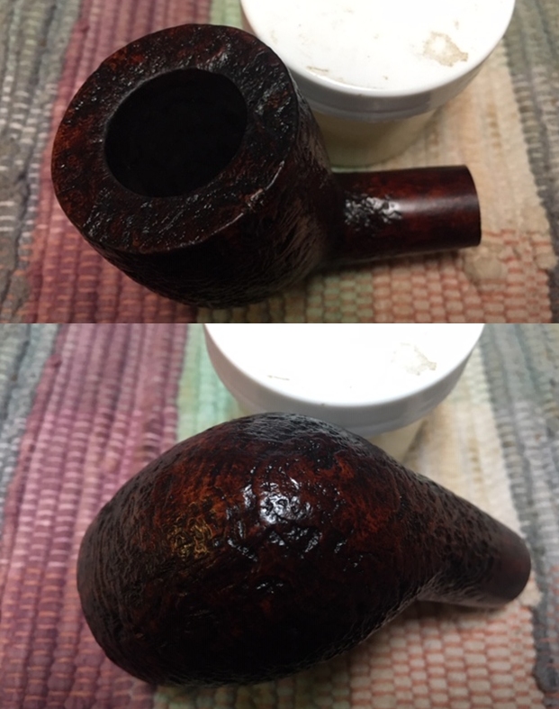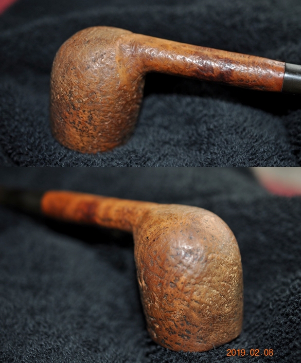 The Knute Freehand pipe with plateau on the rim top and shank end is stamped on the left side of the shank Knute of Denmark. The bowl had nice grain on the sides and cross grain on the front and back and rugged plateau on the rim top and shank end. The finish is very dirty making it hard to see beyond that to the nice grain underneath that. There was a thick cake in the bowl and it had overflowed with lava onto the inward beveled rim top. It was a dirty and tired looking old pipe. The stem was badly oxidized and there were George’s usual tooth marks and chatter on both sides just ahead of the button. The button was also damaged. The other issue with the stem is that it did not really fit the pipe. The tenon was a bit large and I just had a feeling it was the wrong stem. The pipe had been sitting in boxes for a lot of years and it was time to move ahead with the restoration. Jennifer took photos of the pipes she was sending. I have included the two photos of this pipe below.