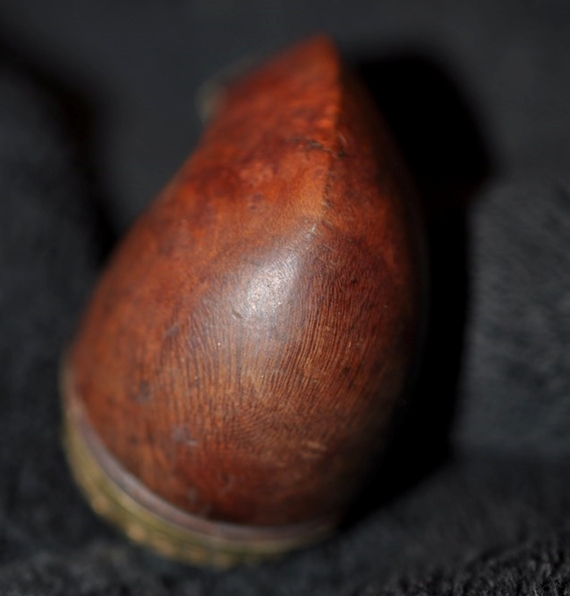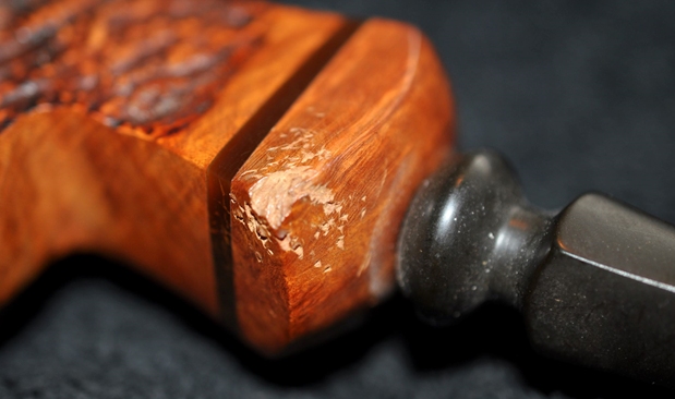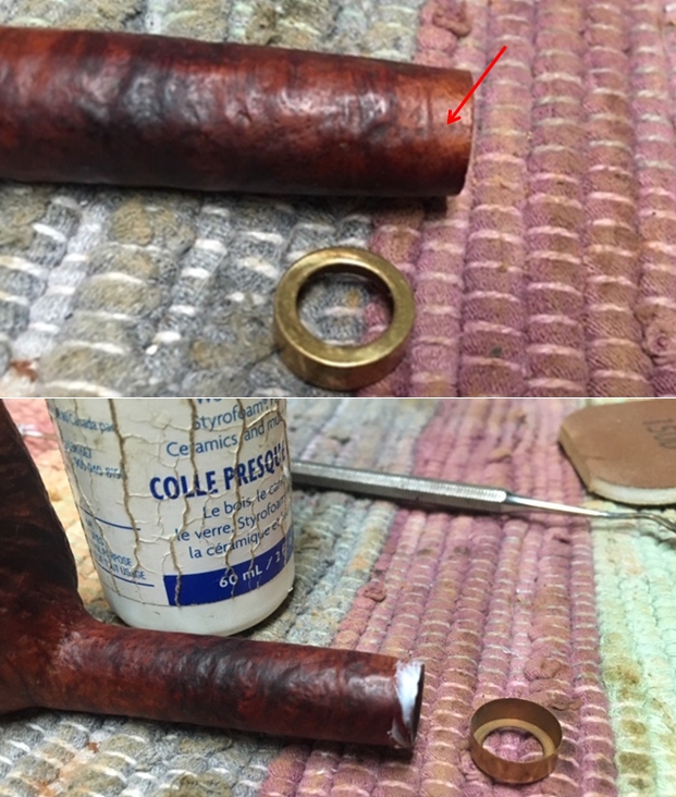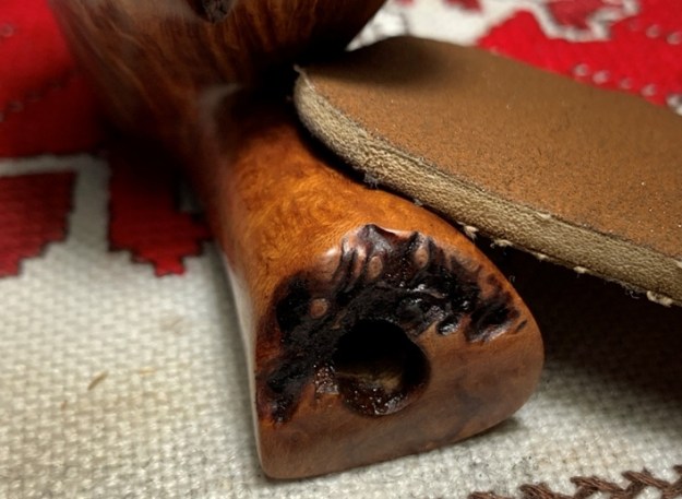 I jumped in and addressed the gouge in the briar on the heel of the pipe. I filled it with briar dust and super glue. Once it cured I sanded it smooth with 220 and 400 grit sandpaper. I restained the sanded spot and the light spots around the rim and shank end of the bowl with a Maple stain pen to match the colour of the bowl and shank.