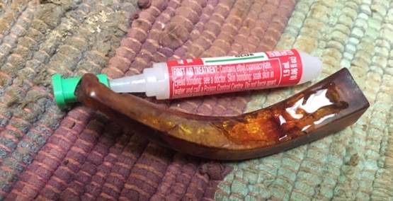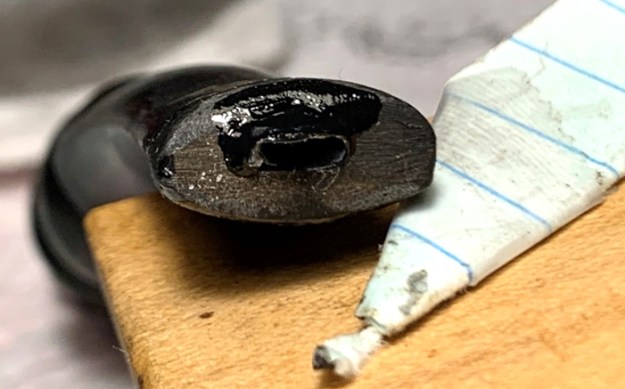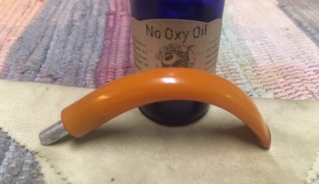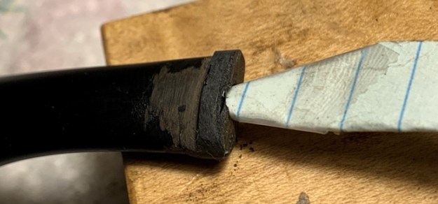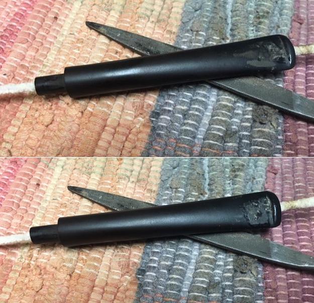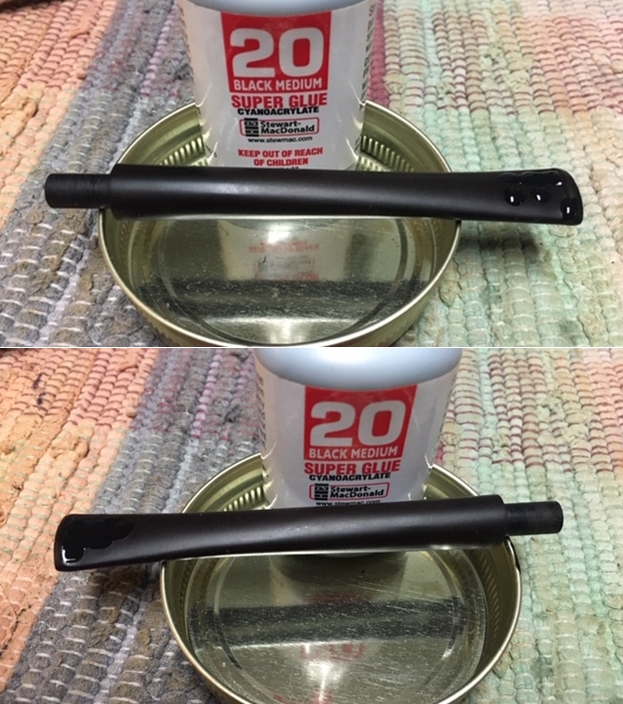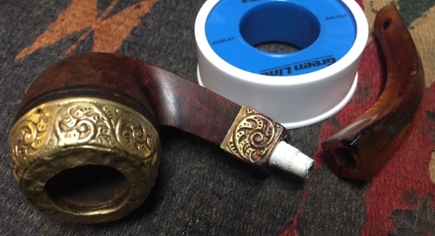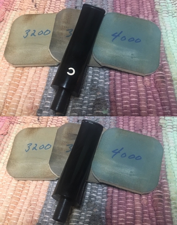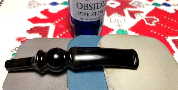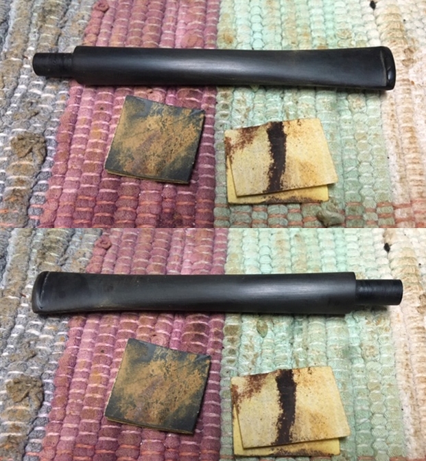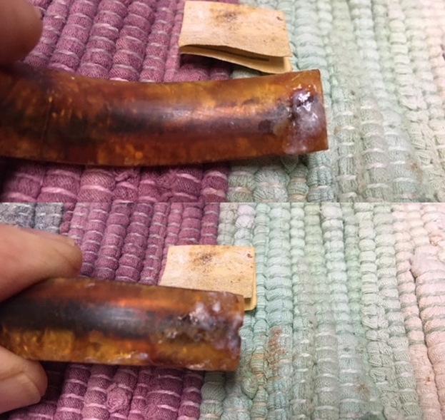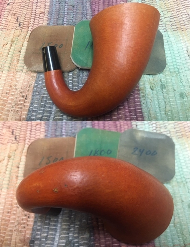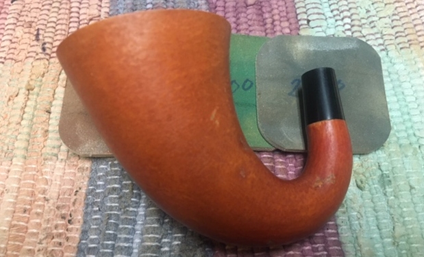 I used running water to cool the stem and set the new bend. I sanded the stem to remove the oxidation that was on the surface with a folded piece of 220 grit sandpaper and a piece of 400 grit wet dry sandpaper. At this point the stem is looking better and I don’t have to deal with George’s tooth marks.