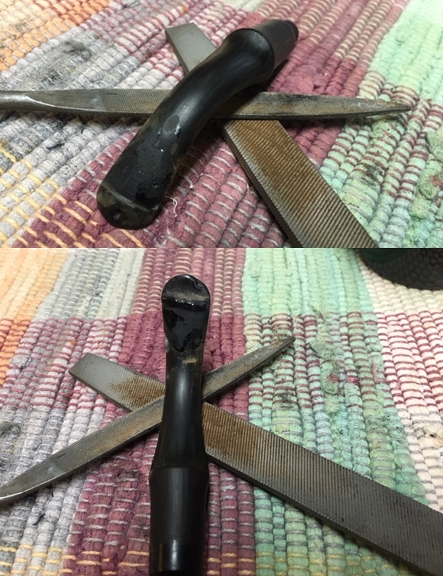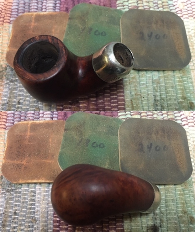 With the bowl done it was time to address the stem. It was in pretty decent condition other than a little residual oxidation in the curves of the turned area and on the tenon area. I sanded the surface of the stem with 220 grit sandpaper to remove the remaining oxidation in the stem surface and the remaining oxidation in the vulcanite. I polished it with 400 grit wet dry sand paper.