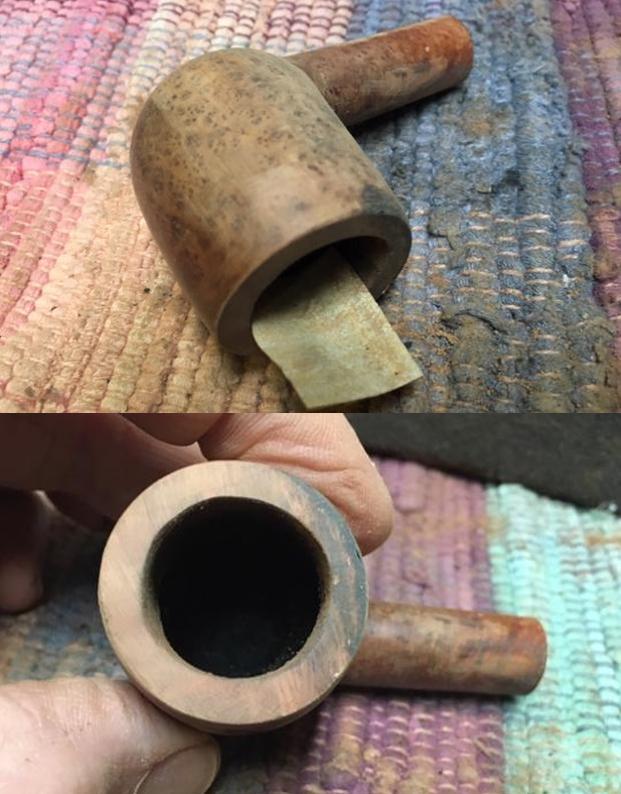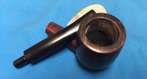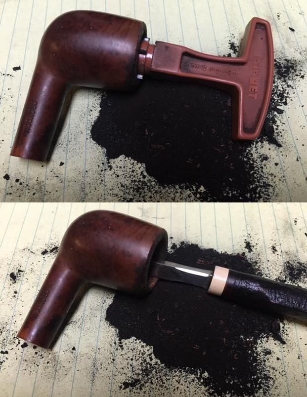 I could no longer postpone starting the work on this old pipe. Since I am a pipe refurbisher I had to get started on this beast. I began the work by reaming the bowl. I started with the smallest PipNet Reamer cutting head so as not to damage the bowl. The old fellow had chipped away enough of the carbon to smoke a little toward the end but he had done so at an angle so there was a nice concave cup in the back wall of the bowl. I had to work carefully through the cutting heads to straighten out the bowl. I used the first three cutting heads to get it reamed out. I took photos of each cutting head to chronicle that work. You can see the growing mound of carbon under the pipe in the photos. It was quite unbelievably hard. I cleaned up the edges and bottom of the bowl with a Savinelli Fitsall Pipe Knife. I sanded the inside of the bowl with 220 grit sandpaper wrapped around a piece of dowel to further smooth out the bowl. It really was one of the worst cakes that I have worked on. Once I was finished reaming it the airway was still clogged going into the bowl because of the tars and oils.