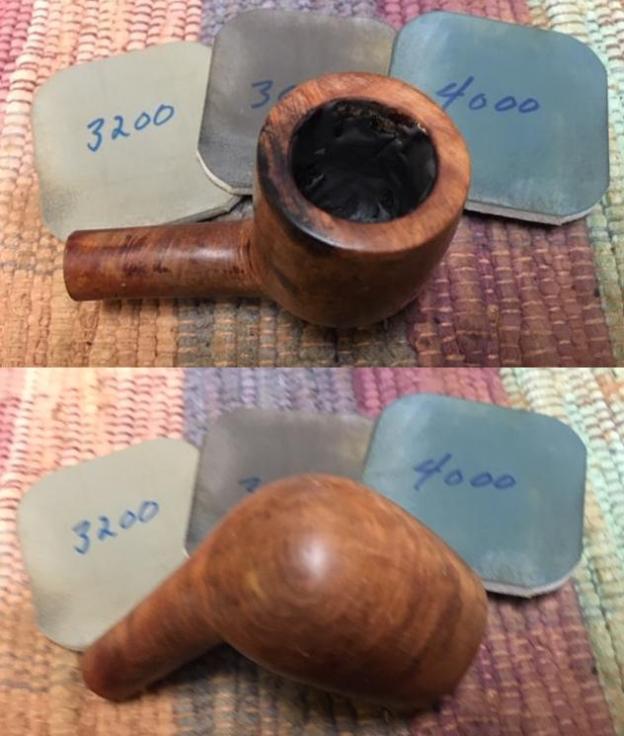 I sanded the repaired areas on both sides of the stem with 220 grit sandpaper to blend them into the surface of the stem. I followed that by sanding them with a folded piece of 400 grit wet dry sandpaper to begin the polishing.