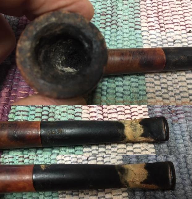 Currently I am not taking on more work for repairs from email or online requests as I am just too busy. I still get the odd referral from the local Vancouver cigar and pipe shop that I feel obligated to repair or restore. They tend to be spread out a bit so I can fit them in among the other work that I am doing for estates. Earlier this week I received a phone call from a fellow who had been referred to me by the shop. In our conversation he said that he had some pipes that the stems were all loose on and he wanted to know if I would be able to help him. I have learned to not make any arrangements until I have the pipes in hand and have examined them. He came over Friday afternoon to let me have a look at the pipes. He handed me a bag and inside there were four or five extra stems that he had brought for my use. There were also three old and tired pipes. They were in very rough shape. Two were apple shaped pipes stamped VB and one was a Croydon billiard. The stems were indeed loose on two of the pipes and stuck on the third pipe. The bowls were clogged with a thick cake to the degree that I could not even get my little finger in them. The stems had a thick layer of calcification and some tooth marks. They needed a lot of work.