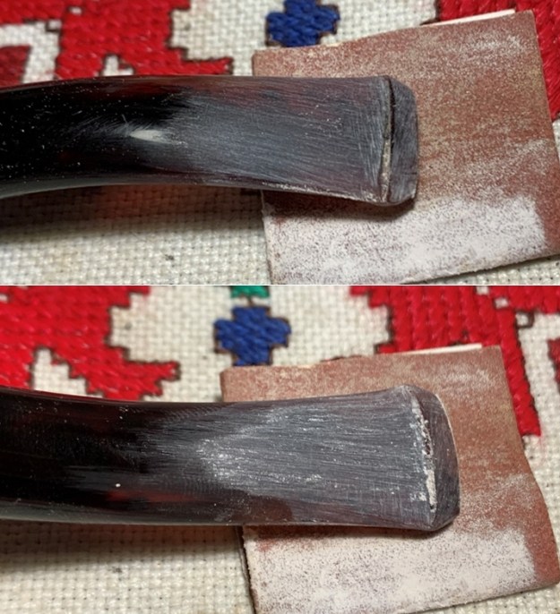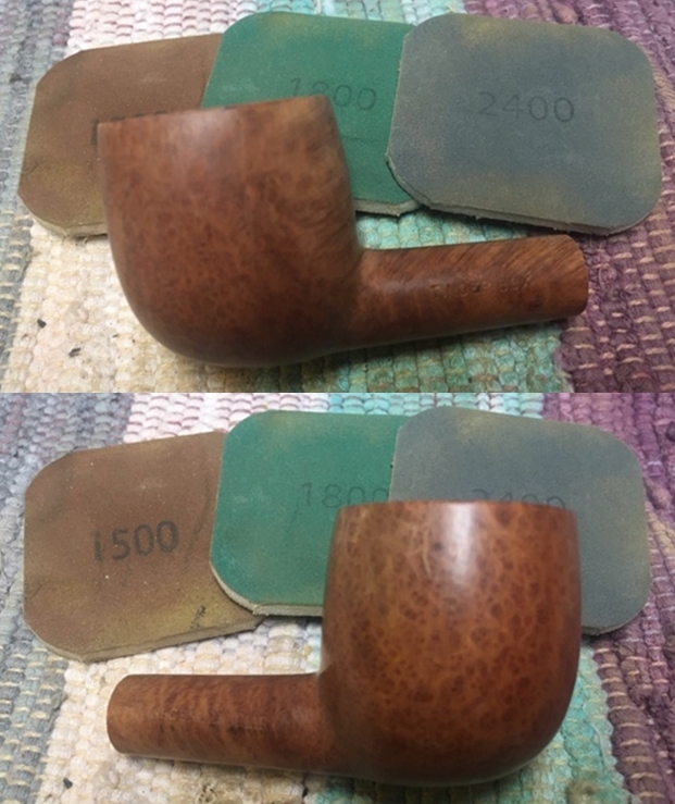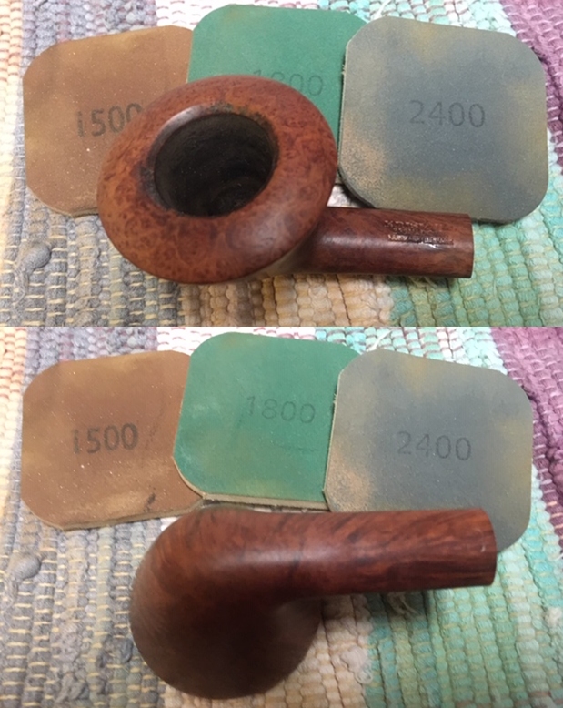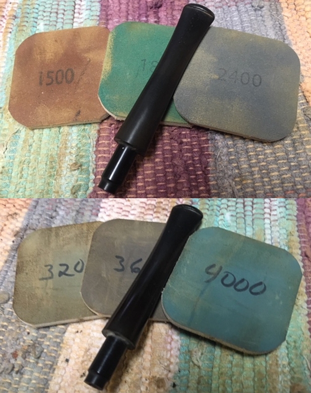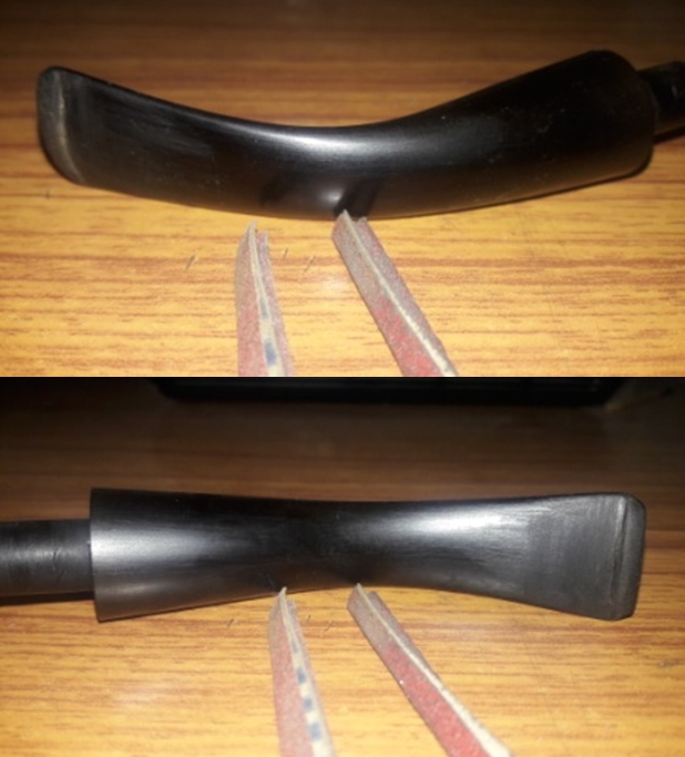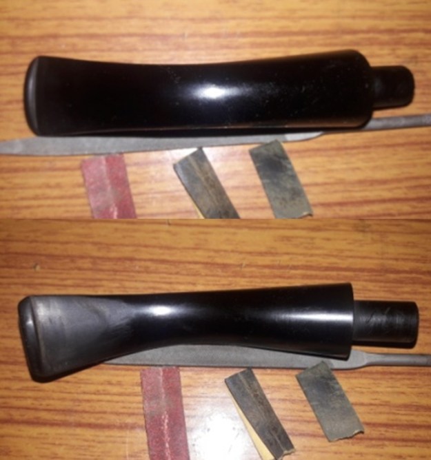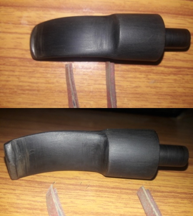 Once the glue repair cured I sanded it with 220 grit sandpaper to blend it into the surface of the vulcanite. I sanded out the tooth chatter and marks on both sides with 220 grit sandpaper and 400 grit wet dry sandpaper.