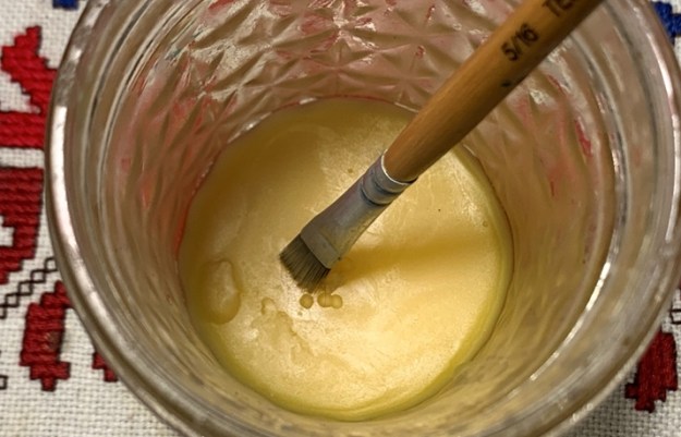 I wiped the bowl down with acetone on a cotton pad to break through the thick varnish coat on the bowl. It took a bit of scrubbing but it looked far better.