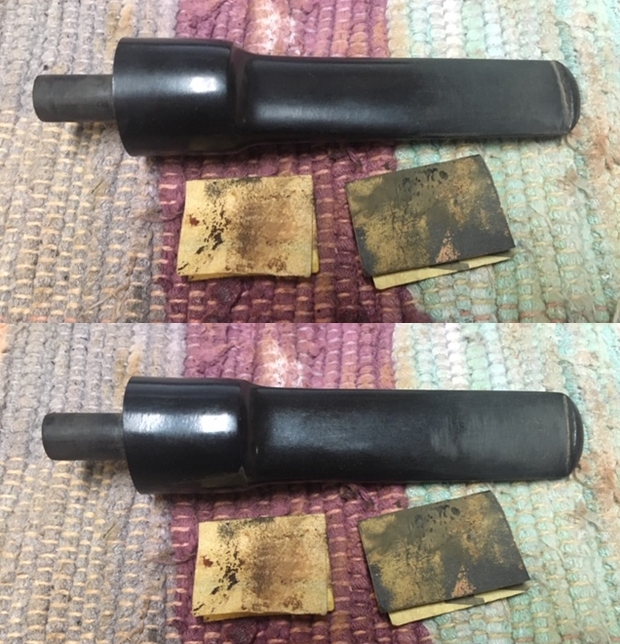 I set the bowl and I turned my attention to the stem. I scrubbed the stem with Soft Scrub and a cotton pad to remove the oxidation and debris on the stem surface. The tooth marks were clearer and the chatter was ready to be polished out.
