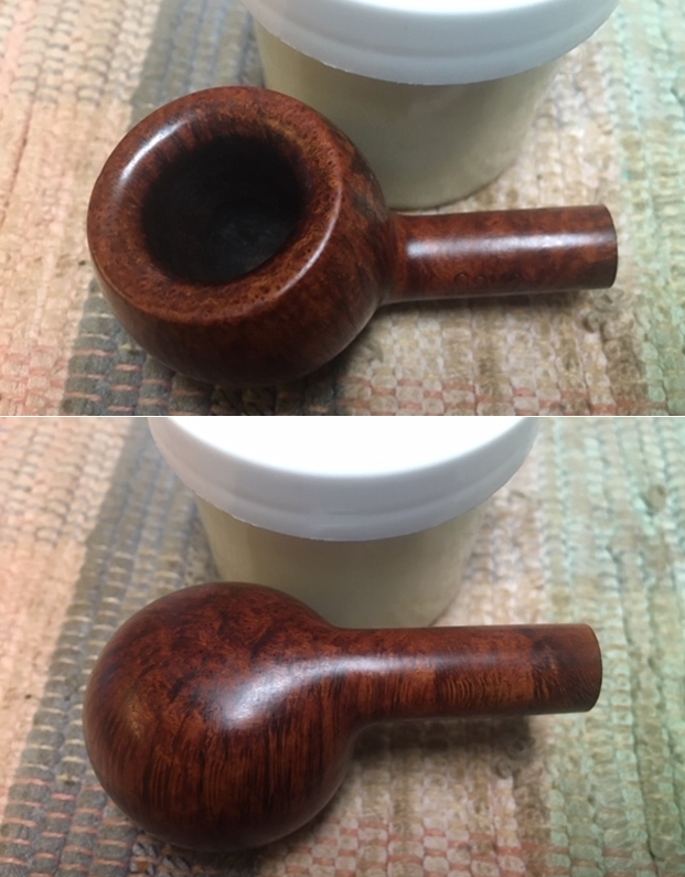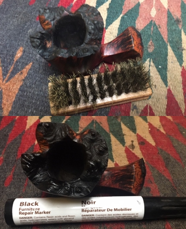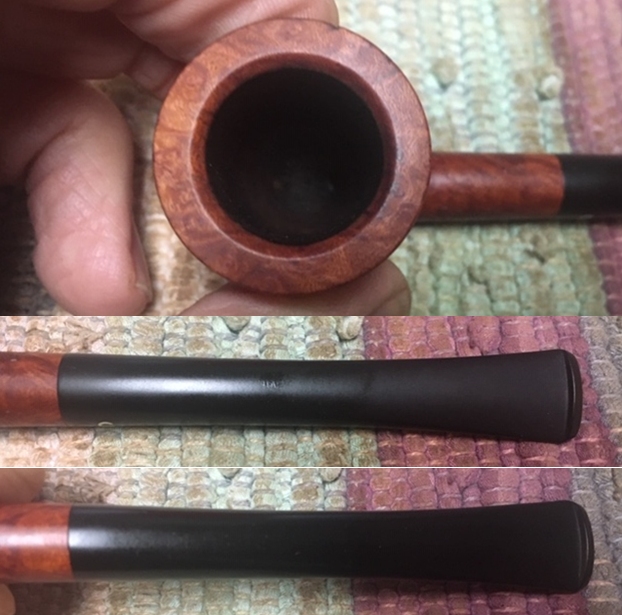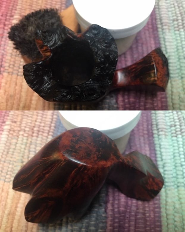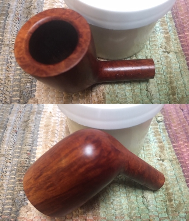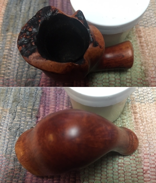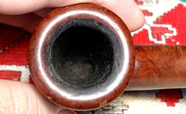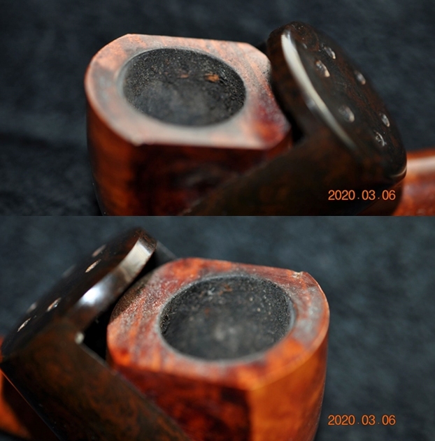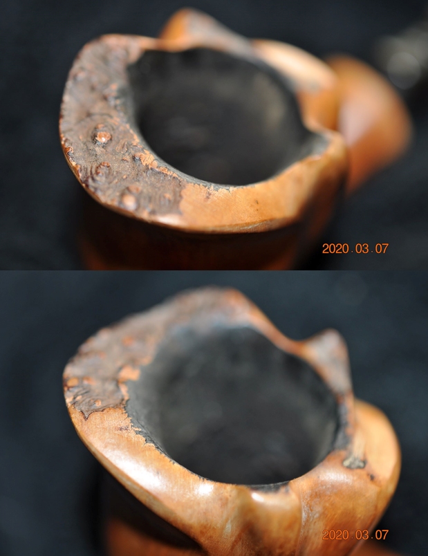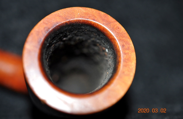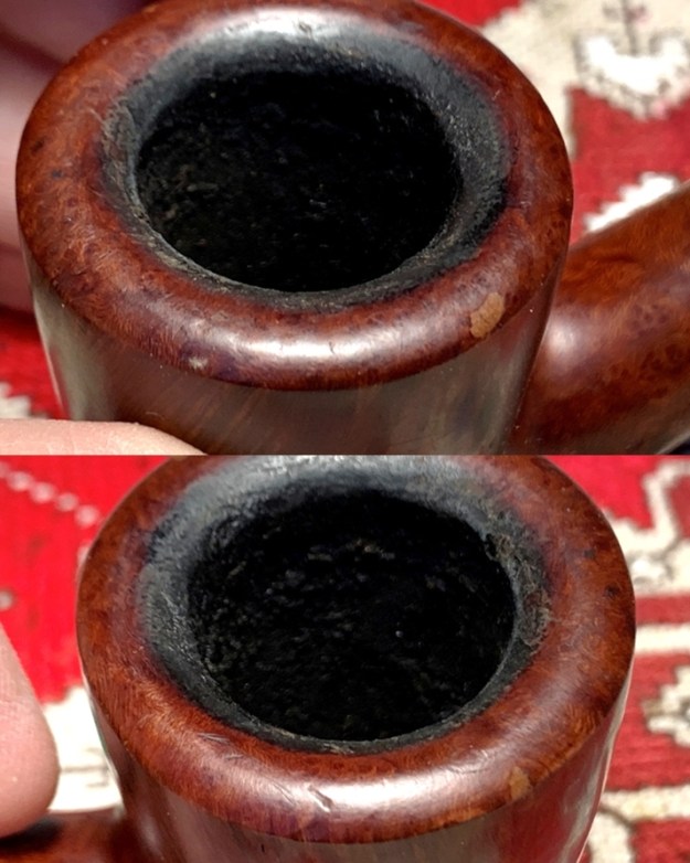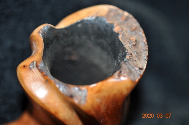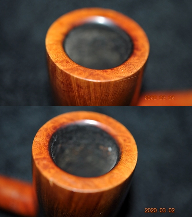 He took photos of the bowl and rim top to show their general condition. You can see the tars on the inner edge of the beveled top. The cake in the bowl is quite thick and there is tobacco debris on the walls of the bowl. The finish on the bowl is dull but still very stunning.
