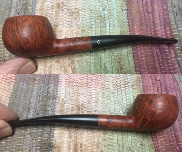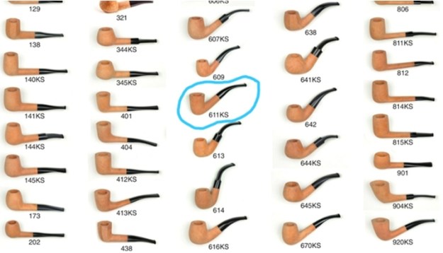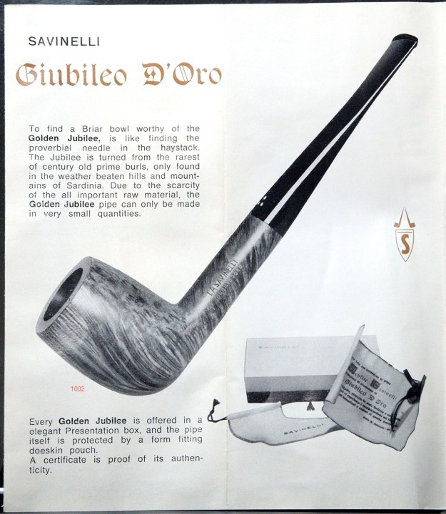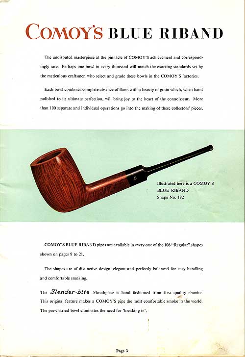 Specimen Straight Grain. I am not sure when this grade was first produced, but it probably appeared just before the Second World War. This certainly was the top grade from its introduction. It is described in my 1965 catalogue as “The rarest and finest of all Comoy pipes. It is so unusual to find a completely perfect straight grain that shapes and quantities are strictly limited.” It was priced at $50 in 1943 and 1965. Jacques Cole recalls that, in the 1950s, there was a very large bent that was reckoned to be about the “perfect” Straight Grain. It was not for sale but used as an exhibition piece and valued then at £500.