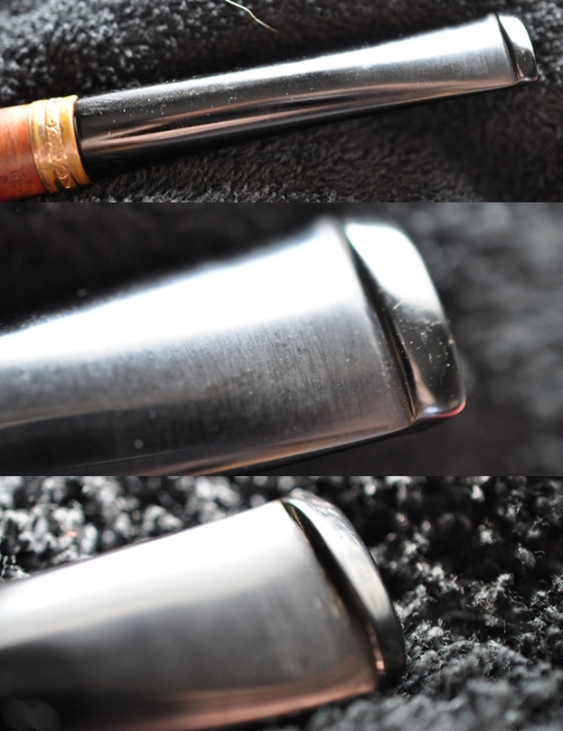 I took some photos of the rim top and stem. The rim top and bowl looked very good. The cake and lava overflow were gone and the inward beveled rim was very clean. Jeff had been able to get rid of the darkening, lava and tars and left behind a smooth rim top. Even the slight nick on the outside right edge of the rim top looked better. The close up photos of the stem shows that it is a much cleaner and better looking stem. The light tooth chatter was gone and the stem looked really good.