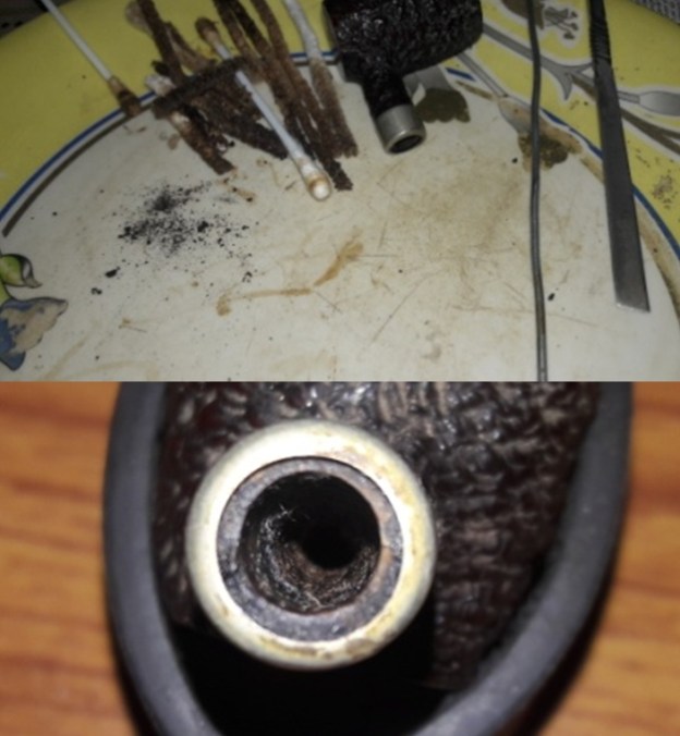 I cleaned out the mortise area and airway to the bowl and the interior of the metal tube and airway in the stem with pipe cleaners, cotton swabs and alcohol. The aluminum tube was dirty because it was missing the distillator and had been smoked sans filter.