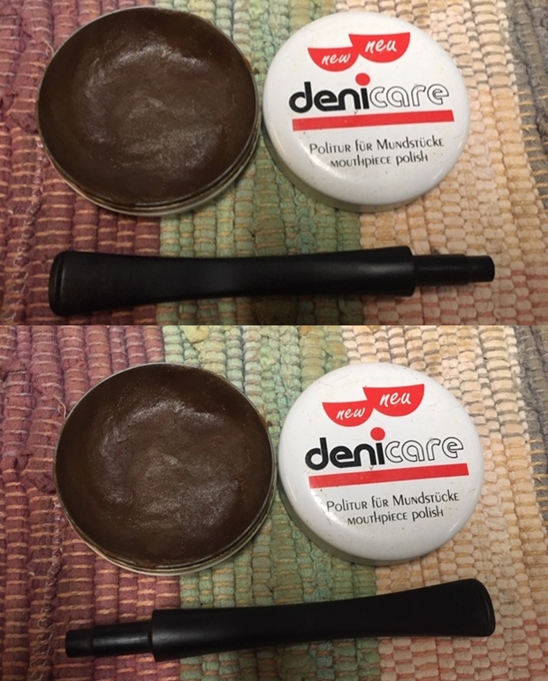 I polished the stem with Denicare Mouthpiece Polish from a tin of it I have in the drawer here. It is a gritty red paste that I rub on with my finger tips and work into the surface of the stem and button and buff off with a cotton pad. It gives me a bit of a head start on the polishing work.