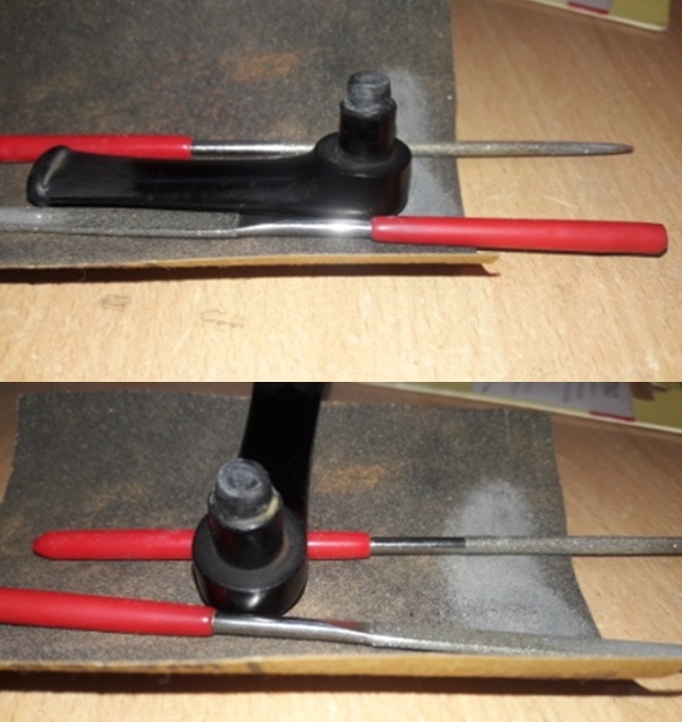 Using 240 grade paper, I sand the upper and lower bit area as well as the button.