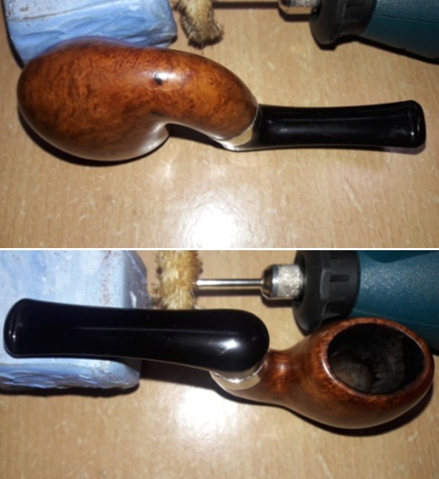 Now in the home stretch. After rejoining the stem and stummel, a cotton cloth buffing wheel is mounted to the Dremel to apply Blue Diamond compound to stem and stummel. With the speed set at about 40% full power the fine abrasive is applied to the surface.
