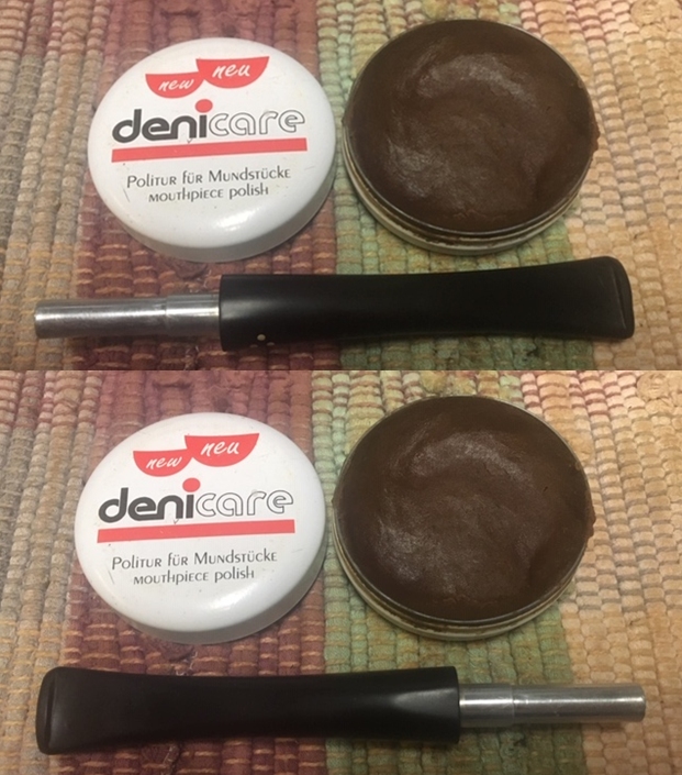 I polished the stem with Denicare Mouthpiece Polish from a tin of it I have in the drawer here. It is a gritty red paste that I rub on with my finger tips and work into the surface of the stem and button and buff off with a cotton pad. It gives me a bit of a head start on the polishing work.