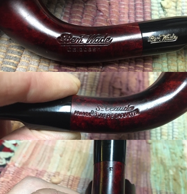 This St. Claude, France Ben Wade Calabash is quite stunning. The shape and flow of the briar, the rich red stains and the curve of the Lucite stem all combine to create a shape that is elegant and beautiful. Jeff picked this pipe up from a favourite shop in Utah. I have never seen one of these before even though I have worked on a lot of both English and Danish Ben Wade pipes. This one is a French Made Ben Wade. It is stamped on the left side of the curved shank with the words Ben Wade in script over Calabash. The name is also stamped on the left side of the half saddle stem. On the right side it is stamped St. Claude arched over Bruyere Garantie. To the left is a very tight stamp France. On the underside of the shank it is stamped with the letter F. There appears to be remnants of gold leaf in the stamping on both sides of the shank. It can be seen in the photos below. Jeff took some photos of the pipe before he began his cleanup work on it.