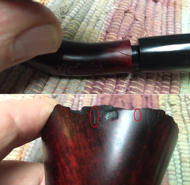 Jeff and I were talking on Facetime and he was showing me how well the pipe had cleaned up. We do that often as he is in Idaho and I am in BC Canada. While he was carefully turning the stem into the shank we both heard and audible “POP”. That sound is a pipe restorer’s nightmare. If you have not heard that sound I can guarantee you will one day. Jeff groaned and showed me the crack in the shank. So when it arrived here in Vancouver I had a look. I took a photo of the crack and have included it below. It is on the top left side of the shank and is a good ½ inch long. That would need to be repaired. I also found some small hairline cracks on the top right side near the plateau top. They were not deep or serious but nonetheless they were present.