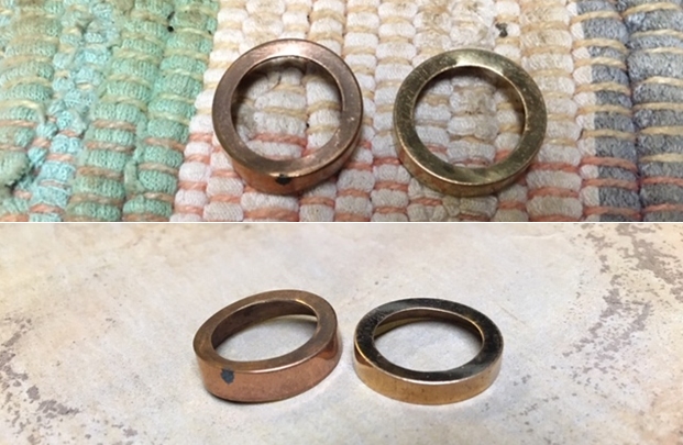 I decided to deal with the cracked shank first. I went through some brass bands that I have that are polished gold in colour and would go well with the gold stamping on the stem and shank. They were quite thin and some have an inward bevel on the shank cover. I chose the band on the right and used my topping board to reduce the depth of the band by half. I wanted to retain as much of the stamping as possible and still bind the cracked shank together.