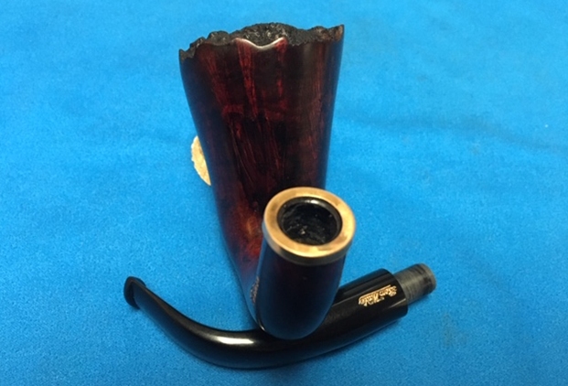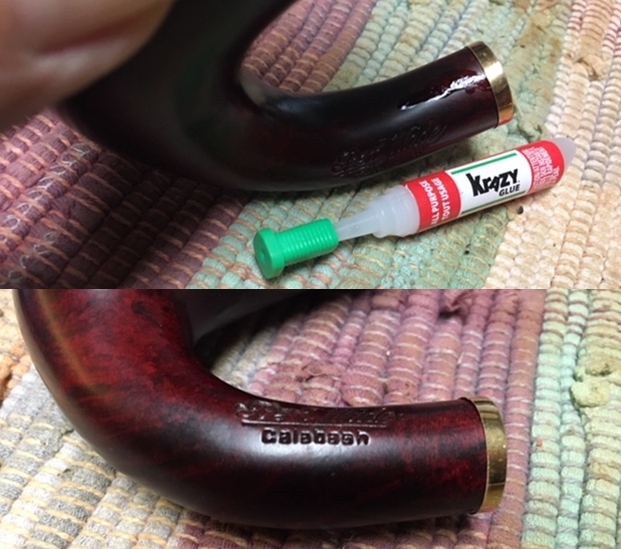 I spread the crack in the shank and pushed some CA Glue into the space. Because of the way the curve in the shank I could not drill and hole at the end of the crack. I clamped it together until the glue cured. I did not glue the band on at this point because I wanted to touch up the gold stamping before I put it in place. Once the repair cured I put the stem on the shank and took a photo to give an idea of what the band looked like with the stem in place.