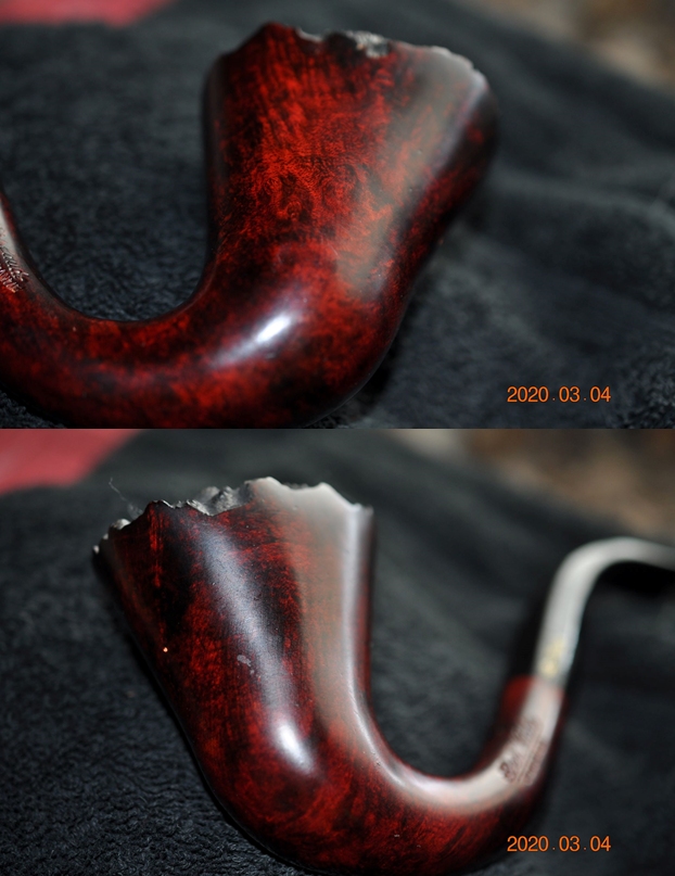 I have found that the Mahogany stain pen I have blends really well with oxblood or cordovan stain. I touched up the sanded areas on the shank top, right side of the bowl at the topo and the back of the bowl with the pen and let it cure.