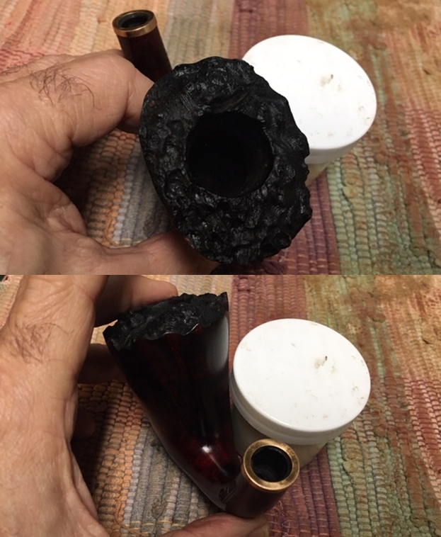 I took close up photos of the stem and the rim top to show the condition. The cragginess of the plateau is clean and shows the peaks and valleys in their fullness. You can also see some of the worn spots on the rim top where the finish has been removed. The stem looks good. The photo of the underside shows the deep tooth marks next to the button (third photo).