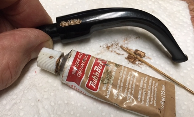 I polished the stem with Denicare Mouthpiece Polish from a tin of it I have in the drawer here. It is a gritty red paste that I rub on with my finger tips and work into the surface of the stem and button and buff off with a cotton pad. It gives me a bit of a head start on the polishing work.