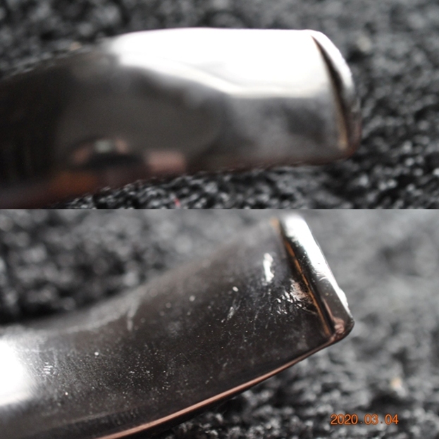 The acrylic/Lucite stem was dirty and there were tooth marks and chatter on the top and underside. There was one deep tooth mark on the underside up against the button edge. The flat surface of the button had tooth chatter and wear on both sides. Jeff also took a photo of the gentle curve of the half saddle stem and I have included that below.