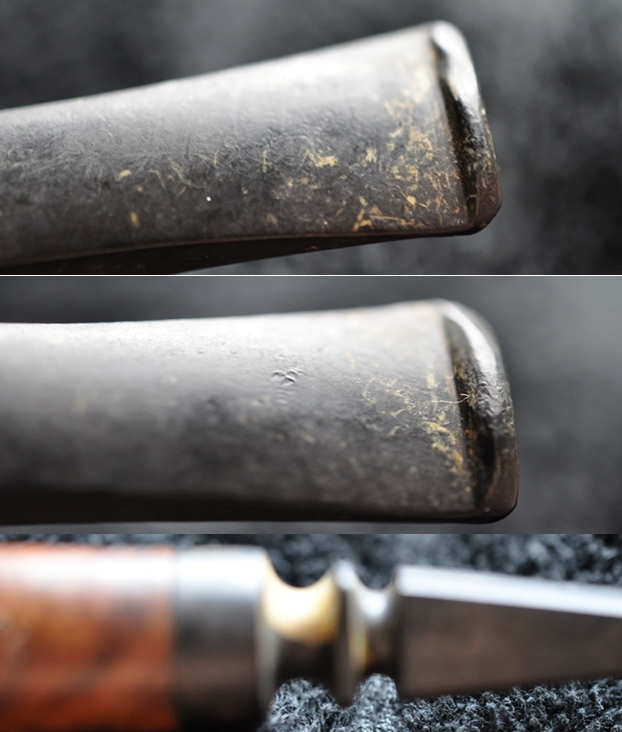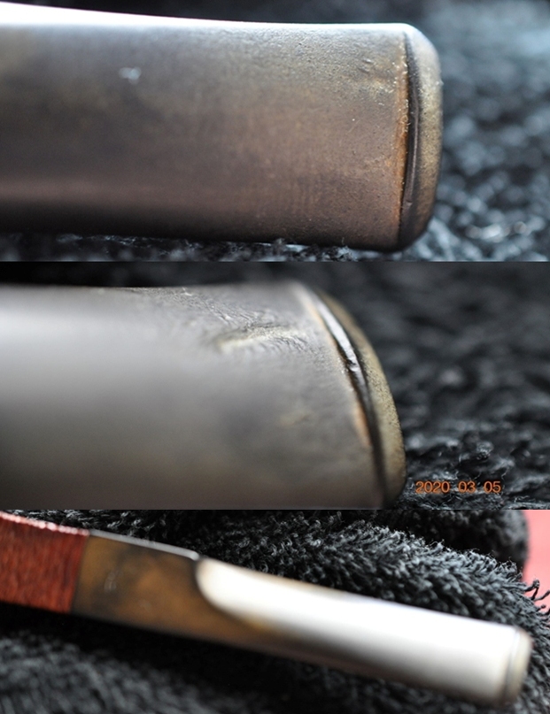 I set the bowl aside and turned my attention to addressing the issues with the stem. I “painted” the tooth marks with the flame of a Bic lighter to try and raise them a bit. Remember vulcanite has “memory” and if the marks are not sharp edge the heat well raise them. In this case while they came up some on the blade there were still two deep marks.