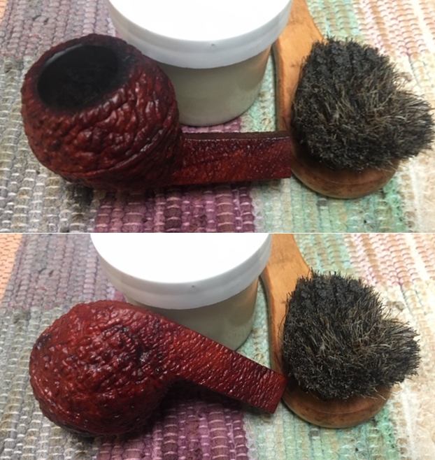 I worked some Before & After Restoration Balm into the smooth briar with my fingertips and the plateau and sandblasted side with a horsehair shoe brush. The product is a great addition to the restoration work. It enlivens, enriches and protects the briar while giving it a deep glow. I appreciate Mark Hoover’s work in developing this product.