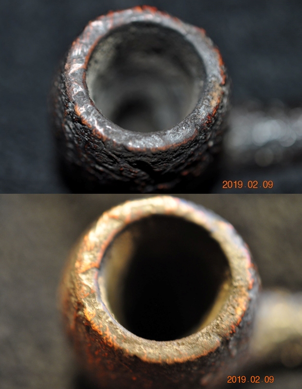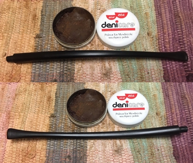 Pipephil’s site has several examples of the Aldo Velani line depicted which tend to be very stylish and nice-looking pipes which confirms the Pipedia assertion that Casare Brontini produced the Aldo Velani lines primarily for export.  It is evident that there was not a consistency in the stem stamping or name style for Aldo Velani as different examples are given.  Here are the stem stamping variations provided by Pipephil:With a better understanding of the Aldo Velani Trio Bent Apple before me, I begin his refreshing by cleaning.  I start by disassembling the parts – I find that the gold ring easily is removed which will allow cleaning of each element to be easier.I then take the stummel and ream the chamber using the Pipnet reaming kit.  I use the 2 smaller blade heads then switch to the Savinelli Fitsall tool.  Then sanding the chamber wall is done with 240 grade paper wrapped around a Sharpie Pen to further clean away the remaining vestiges of carbon.  I wipe the chamber with a cotton pad wetted with isopropyl 95% and after inspection of the chamber, all appears to be healthy briar – I forgot to take a picture! Next, to clean the external surface undiluted Murphy’s Oil soap is used with a cotton pad.  The smooth surface is easily cleaned.  Using a brass wire brush and a little help from my thumb’s fingernail the remaining lava is cleared. The stummel is then transferred to the kitchen sink where the internal mortise is cleaned with shank brushes and anti-oil dish liquid soap.  After scrubbing, the bowl is thoroughly rinsed and returned to the worktable. Continuing with the internal cleaning, I use two pipe cleaners and one cotton bud wetted with isopropyl 95% to discover that the internals are essentially clean.  Nice for a change!Switching now to the acrylic stem, the shady areas inside the translucent airway I assume is build up which should be able to be cleaned.  I use a combination starting with isopropyl 95% and followed by a Soft-Scrub-like product I can find here in Bulgaria along with both bristled and soft pipe cleaners to clean the airway.  With the bristled pipe cleaners, after wetting them with the CIT, I insert it into the stem and then ‘crank it’ to rotate in the airway.  This does a good job.You can see that some of the burgundy color came off on the pipe cleaner as it cleaned.  There is still some coloration in the airway, but it seems to be clean.After the cleaning of both the stummel and the stem, it is apparent that they are in good condition and for both I move directly to applying Blue Diamond compound, a mild abrasive, to both the acrylic stem and stummel.  The compound will clear very small imperfections on both the stummel and acrylic surfaces.  At this point, the gold-plated ring is kept off the shank for the application of compound.  With a cotton cloth buffing wheel mounted to the Dremel and speed at about 40% full power, compound is applied to both stem and stummel.After the compound and after I wipe the pipe down with a felt cloth to clear the compound dust from the pipe, another cotton cloth buffing wheel is mounted with the same speed and carnauba wax is applied to only the stummel.  The acrylic stem cannot be improved with wax!  Following the application of wax, I use a microfiber cloth to give the pipe a vigorous hand buffing to raise the shine.A few more small projects are left.  The ‘AV’ stamping on the acrylic needs refreshing.  To match the gold ring, which is gold – the stamping in gold is a very nice touch.Using European Gold Rub’n Buff I apply a small amount of gold over the stamping.  And as the name says, I rub and buff!  The results are very nice. Before reattaching the double-bump ring to the shank, I clean it using 000 steel wool.Then, placing a small amount of Extra Thick CA glue to the inside of the ring, I attach it to the shank. I use thick CA glue and only a small amount so that it doesn’t run over the confines of the ring.With the ring reattached, the Aldo Velani Trio Bent Apple stummel and fancy acrylic stem are rejoined and enjoy another hand buffing with a microfiber cloth to raise the shine.
