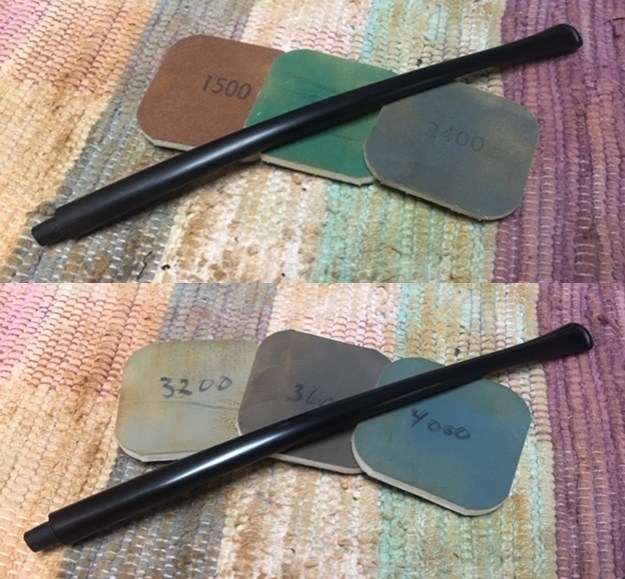 There was no need to ream the pipe, so I used a piece of 320 grit paper on a reamer bit to clean up the bowl.  The pipe was soaked with alcohol and sea salt.  Following the soak, the stem was mounted and I started to remove the oxidation.  There was a small tooth indention on the underside of the button, which raised nicely with heat from a lighter flame.  The oxidation was removed with 800, 400, 1500 and 2000 grit wet paper.  The stem was buffed with White Diamond and Meguiars Plastic polish.