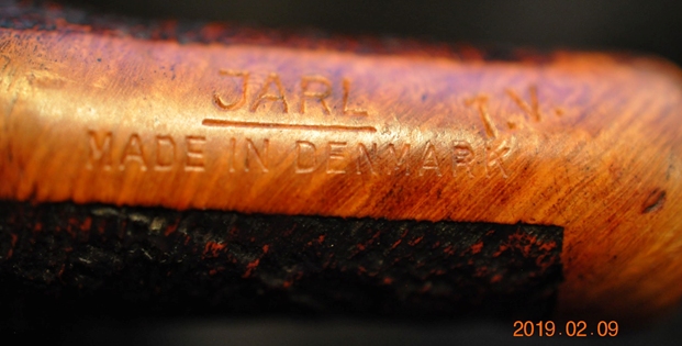 The pipe on the table is stamped on a smooth panel on the underside Jarl Made in Denmark T.V. The bowl is sandblasted with a smooth band on the rounded shank end and panel underneath for the stamping. The finish was very dirty, making it hard to see beyond that to the nice grain underneath that. There was a thick cake in the bowl and it had overflowed with lava onto the rim top. It was hard to know at this point the condition of the rim edges. The pipe was a dirty and tired looking old pipe. The stem was badly oxidized and there were George’s usual tooth marks and chatter on both sides just ahead of the button. Due to the dirtiness of the pipe the stem did not seat in the shank. It had been sitting in boxes for a lot of years and it was time to move ahead with the restoration. Jennifer took photos of the pipes she was sending. I have included the two photos of this pipe below. When the box arrived from Jennifer, Jeff opened it and took photos of each pipe before he started his cleanup work on them. This Jarl T.V.pipe was a nicely shaped pipe. The shape was interesting and though I have worked on quite a few Jarl pipes over the years this is the first one that I have seen marked T.V. pipe. It is really a nice little Churchwarden. This was going to be an interesting restoration. Jarl pipes are well made and I have found that they not mentioned much in the online pipe communities that I frequent. I enjoy working on them. The sandblast finish on the pipe looks really good on this piece of briar. The shank end is rounded and the stem is smaller and sits against the end of the shank. The briar appeared to be in good condition underneath the grime. The finish looked intact under the grime and oils on the bowl sides from George’s hands. The bowl had a thick cake that had hardened with time. The lava overflow on the rim top filled in much of the sand blast. It was very thick but it could very well have protected the rim from damage. We won’t know what is under it until Jeff had cleaned it off. The stem was heavily oxidized and there were deep tooth marks on both sides just ahead of the button. Jeff took photos of the pipe before he started working on it. I include those below.  Jeff took photos of the bowl and rim top to show the cake in the bowl and the lava build up on the rim top and dust and grime on the bowl. It was thick and hard but hopefully it had protected the rim and edges from damage. The lava coat looks horrible but it points to a well-used, favourite smoking pipe. George must have enjoyed this old timer a lot judging from the condition of the pipe.    Jeff took a photo of the side and heel of the bowl to show the condition of the finish – the grime and grit all over the sides and bottom of the bowl. The sand blast is deep and dirty but it is interesting. Jeff took a photo of the stamping on the left side of the shank. It is very clear and readable. It reads Jarl Made in Denmark T.V.Jeff took photos of the top and underside of the stem showing the scratching, oxidation and tooth marks on the stem surface and button. The tooth marks are quite deep on both sides of the stem.I turned to Pipephil’s site for a quick review of the brand (http://www.pipephil.eu/logos/en/logo-j1.html). I did a screen capture of the section of the site that showed the Jarl T.V. pipe. It says that the brand was carved by Jorgen Larsen. I turned then to Pipedia to gather further information regarding the brand (https://pipedia.org/wiki/Jarl).   :