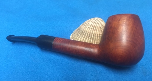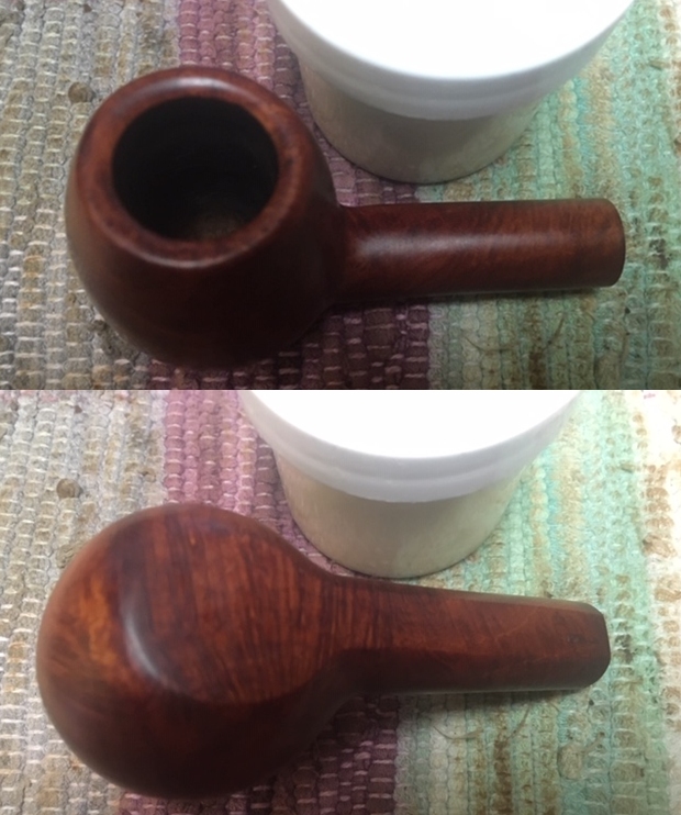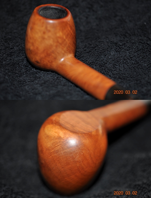 One thing that can be said for staying home and indoors is that I am able to work through the large backlog of pipes in my queue and maybe make a dent. The next pipe on the work table is an interesting egg shaped sitter with a long shank. The only stamping it bears is the Savinell “S” shield and Italy on the underside of the shank. Otherwise there is nothing else. It has a natural smooth finish on the bowl and shank. The grain is mixed but very interesting and flows up and around the bowl and shank. The round shank flows well into saddle stem. The rim top is smooth and crowned inward. There was a thick cake in the bowl and some lava on the inner edge. There was also some darkening. The pipe was dirty and tired looking. The saddle stem was vulcanite and had a slight bend in the blade. There were light tooth marks and chatter on both sides near the button. It was oxidized and spotty. Jeff took some photos of the pipe to show the general condition of the pipe before he started his clean up.