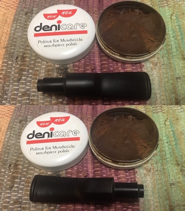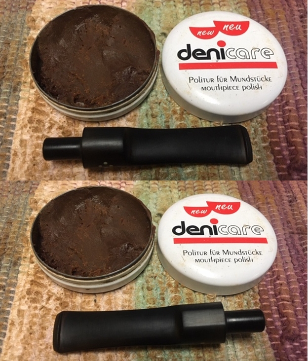 I polished the stem with Denicare Mouthpiece Polish from a tin of it I have in the drawer here. It is a gritty red paste (similar in grit to red Tripoli) that I rub on with my finger tips and work it into the surface of the stem and button and buff it off with a cotton pad. It gives me a bit of a head start on the polishing work.